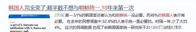 在阅读此文之前,辛苦您点击一下“关注”,既方便您进行讨论和分享,又能给您带来不一样的参与感,感谢您的支持! 10月20日,韩国国家统一研究所公布了一份民调数据,能看出如今的韩国人对朝鲜的看法越来越现实。 51%的韩国受访者认为和朝鲜统一没必要。而49%的韩国人表示有必要。 在去年的民意调查中,52.8%的人表示统一是必要的。时隔一年,少了大约4%。 这次的民调数据,也成了自韩国国家统一研究所于2014年开始相关民意调查以来,不支持统一的人首次超过了支持统一的人。